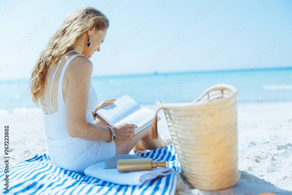 relaxed elegant female on ocean coast with straw bag