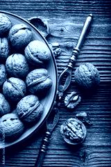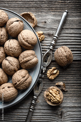 Walnut nuts and kernels in blue plate with a vintage silver nut cracker on old grunge wooden table close up. Food photography