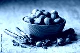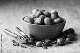 Vintage silver nutcracker on an aged wooden table, used to crack open hazelnuts, captured in a food photography composition