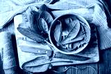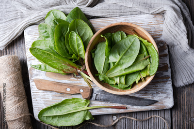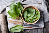 Top view on fresh organic sorrel leaves in wooden bowl with knife close up. Food photography