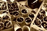 Tomato and pepper seedlings in peat cups. Preparing plants for growing in open ground. Home gardening concept