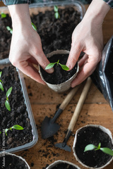 Farmer transplants tomato and pepper seedlings into peat cups. Preparing plants for growing in open ground. Home gardening concept
