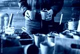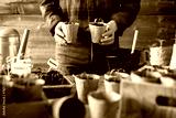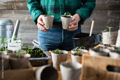 Farmer holding two peat cups with seedlings. Preparing plants for growing in open ground. Home gardening concept