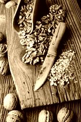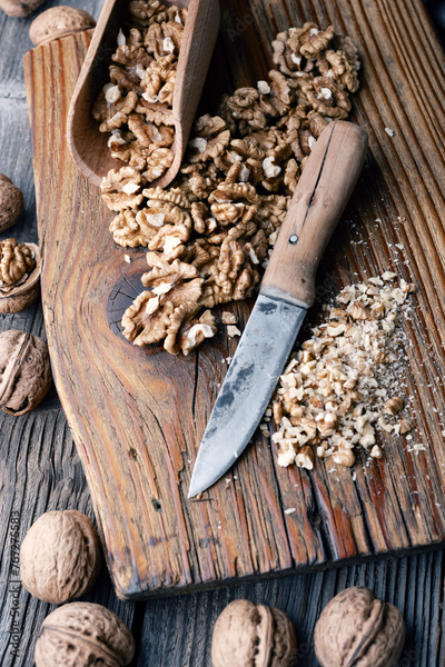 Crushed walnut nuts kernels and knife on wooden plate close up. Food photography