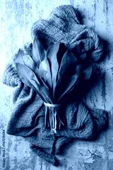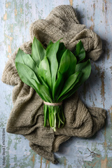 Bunch of fresh bear's wild garlic on kitchen rug close up. Food photography