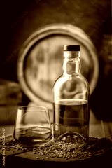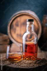 A glass of whiskey with bottle on wooden board. Oak barrel on background. Barley grains and barley ears on a foreground