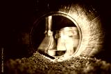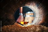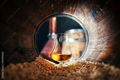 A glass of bourbon whiskey in old oak barrel. Copper alambic and oak barrel on background. Traditional alcohol distillery concept
