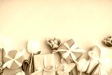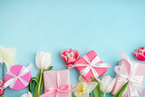 Gift boxes with beautiful tulips and daffodil flowers on blue background