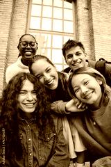 Vertical portrait of a group of friends having fun and smiling together. High school students looking at camera with happy expression. Young friendly real people staring front posing for a photo