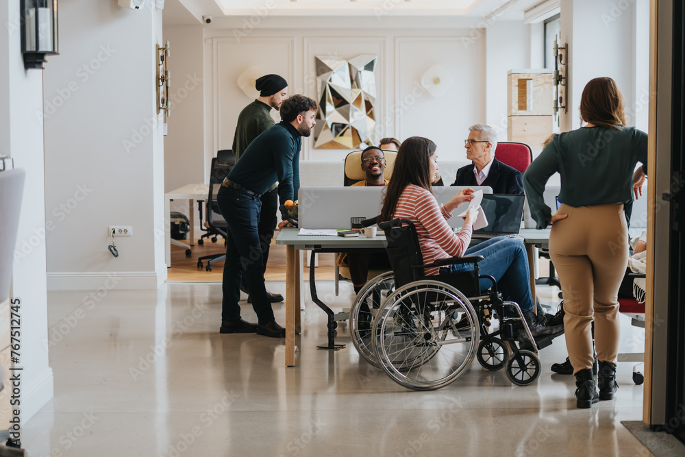 Inclusive business team in a modern office setting engaging in a collaborative discussion.