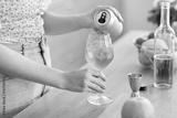 drinks and people concept - close up of woman pouring soda from tin can to wine glass and making orange cocktail at home kitchen
