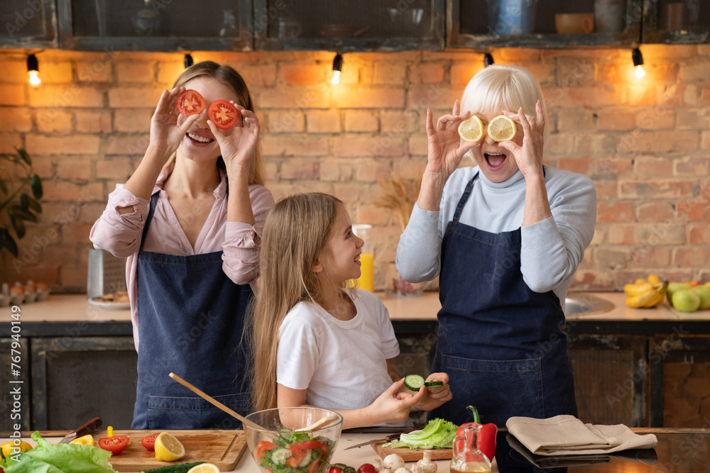 Beautiful woman enjoying with her mother while cooking together and little girl watching on them. Happy daughter, mom, grandmother playing, have fun with vegetables in kitchen