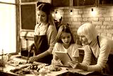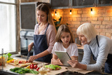 Horizontal shot of senior woman that looking in the tablet with her granddaughter and smiling. Mother cooking vegetarian dinner in kitchen. Women searching recipe in culinary website