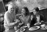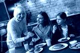 Side view of cheerful mature woman rubbing chocolate in the plate with pancakes for her daughter. Little girl trying some pancake in kitchen. Family have breakfast together