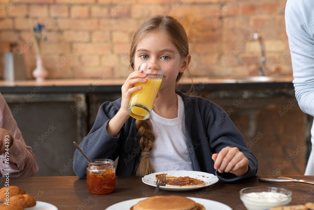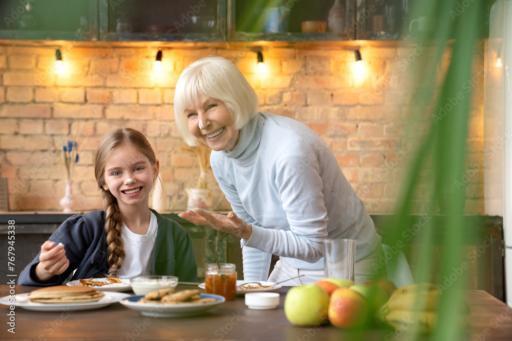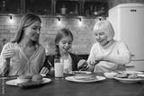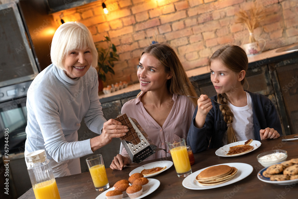 Happy mom, daughter and grandmother eating breakfast in kitchen. Family concept. Careful granny cutting pancakes for her little granddaughter, attractive woman watching for them