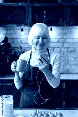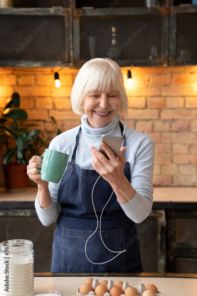 Vertical shot of cheerful senior woman chilling in kitchen while cooking. Happy grey white hair elderly woman with cup of tea listening music on mobile phone in kitchen