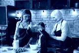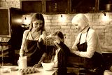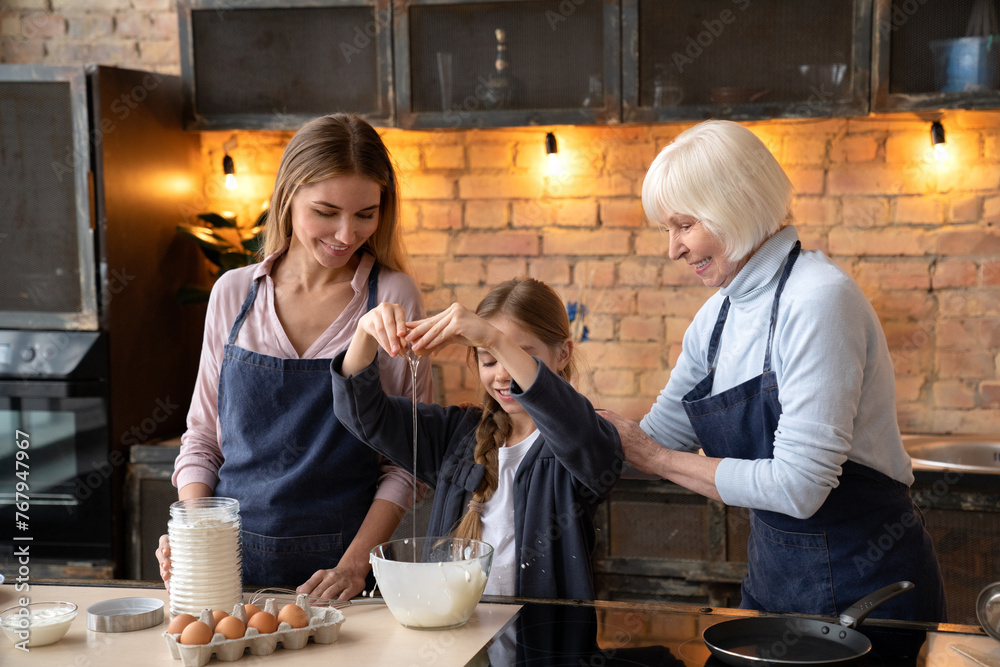 Little girl with her mother and grandmother having fun while cooking in kitchen. Happy three generation of women preparing dough for pancake, cookies, pizza , pasta