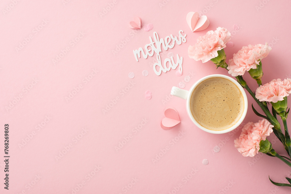 Vogue Mother's Day layout. Top view of whipped macchiato, beaming carnations, loving memo, tiny hearts, and confetti on a blush tinted platform, with vacancy for inscription or advertisements