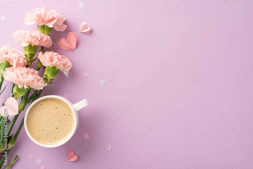Mother's Day tasteful arrangement: Top-view photo of macchiato, blooming flowers, small hearts, and confetti on a pastel purple backdrop, with area for text or marketing