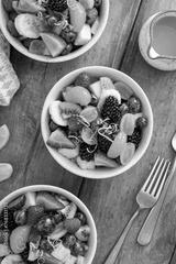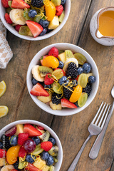 Fruit salad with fresh berries, bananas and apples in small bowls