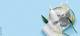 Composition with different cosmetic products, clean towel and beautiful lily flowers on color background