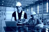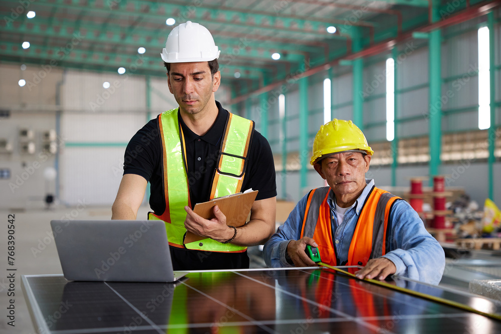 workers or technicians working on laptop computer and checking solar panel in the factory