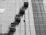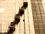 Cantilever scaffolds on a residential building under renovation. The facade is fully covered by plastic sheeting.