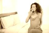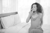pregnant woman drinking water and sitting on the bed