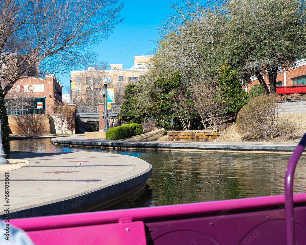 Water taxi cruises along canal with riverside buildings, hotels, restaurants in Bricktown, Entertainment District, Oklahoma City, wintertime bare trees, travel destination and tourist attractions