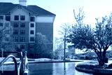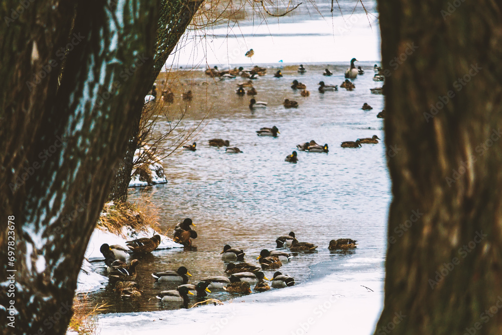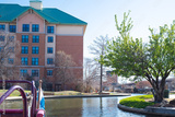 Water taxi cruises along canal with riverside buildings, hotels, restaurants in Bricktown, Entertainment District, Oklahoma City, wintertime bare trees, travel destination and tourist attractions
