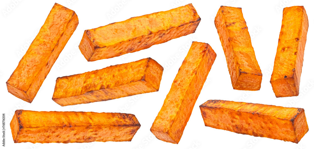 Baked sweet potato sticks isolated on white background