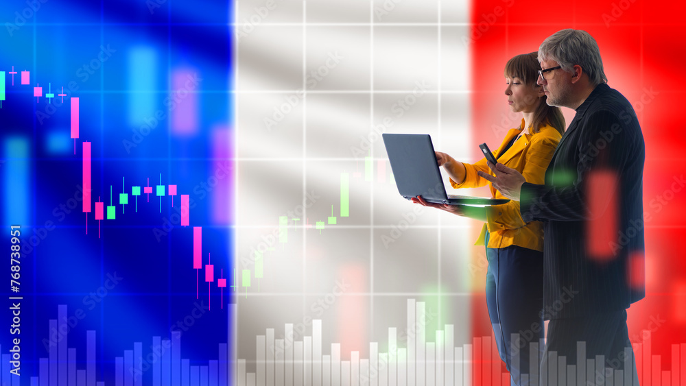 Investors from France. Man and woman near french flag. French stock exchange chart. Business people monitor economic indicators. Investors are withdrawing money from assets in France.