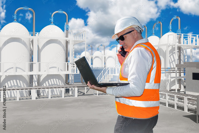 Man inspector near factory. Guy with laptop on territory plant. Inspector man checks chemical production. Industrialist makes phone call. Chemical factory on sunny day. Factory inspector in helmet