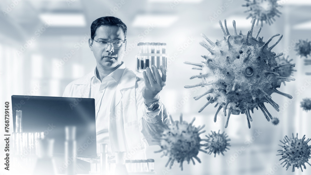 Man virologist. Laboratory assistant with laptop. Virus molecules at will of doctor. Virologist holds test tubes with infection samples. Doctor works in laboratory. Man virologist thought