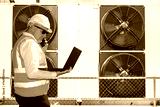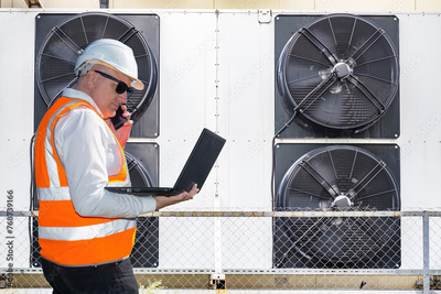 Air conditioners repairman. Man engineer speaks on phone. Guy adjusts air conditioning system. Factory worker controls ventilation equipment. Man engineer near air conditioners. Conditioning tech