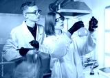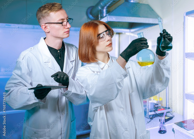 Laboratory staff. Teamwork scientists. Man and girl inside laboratory. Woman scientist with flask in hands. Male assistant to laboratory director. Scientists in white coats. Chemists, biologists