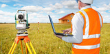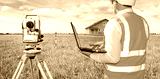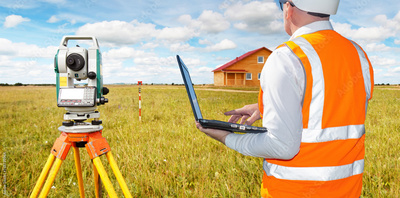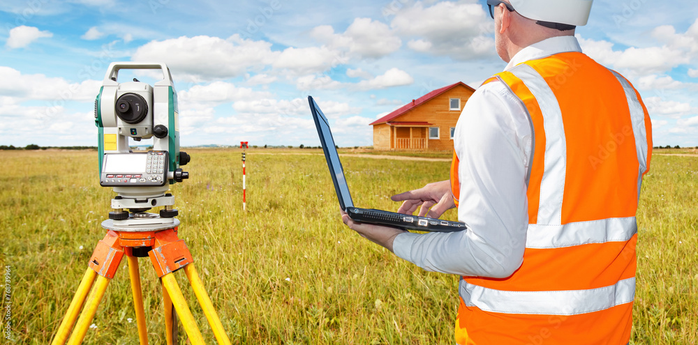 Man with geodetic instrument. Parent surveyor with laptop. Man builder inspects construction site of cottage. Cropped surveyor with his back to camera. Geodetic equipment near builder