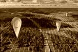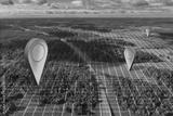 Territory with geotags. Nature view from quadcopter. Place for construction country houses. Picturesque place for erection farms. Construction site near forest. Nature with geotags. Topographic map