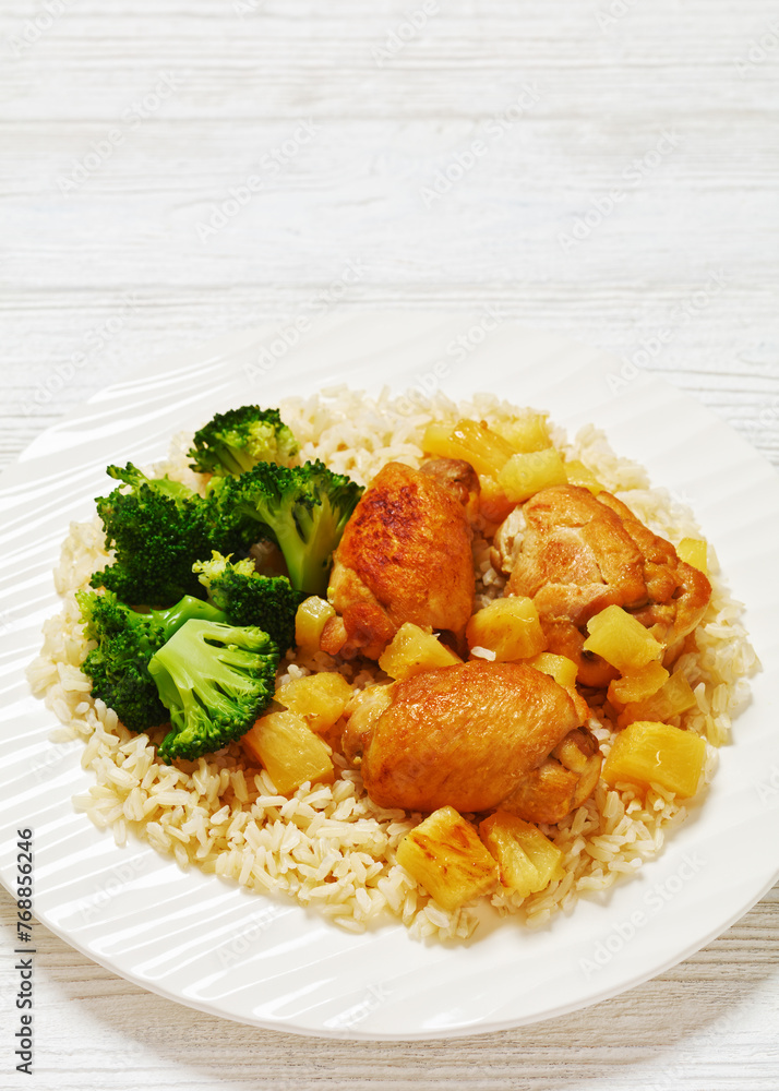 chicken thighs with pineapple, rice and broccoli