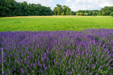 kwitnąca lawenda na rabacie kwiatowej w parku z kolorowymi kwiatami i zieloną łąką