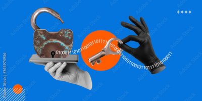 Hacking, leakage of personal data concept. Hand in black rubber glove with key in front of open old padlock on smartphone screen. Minimalist art collage