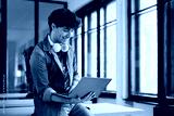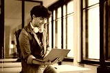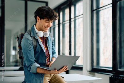 Happy student using laptop in classroom at university.