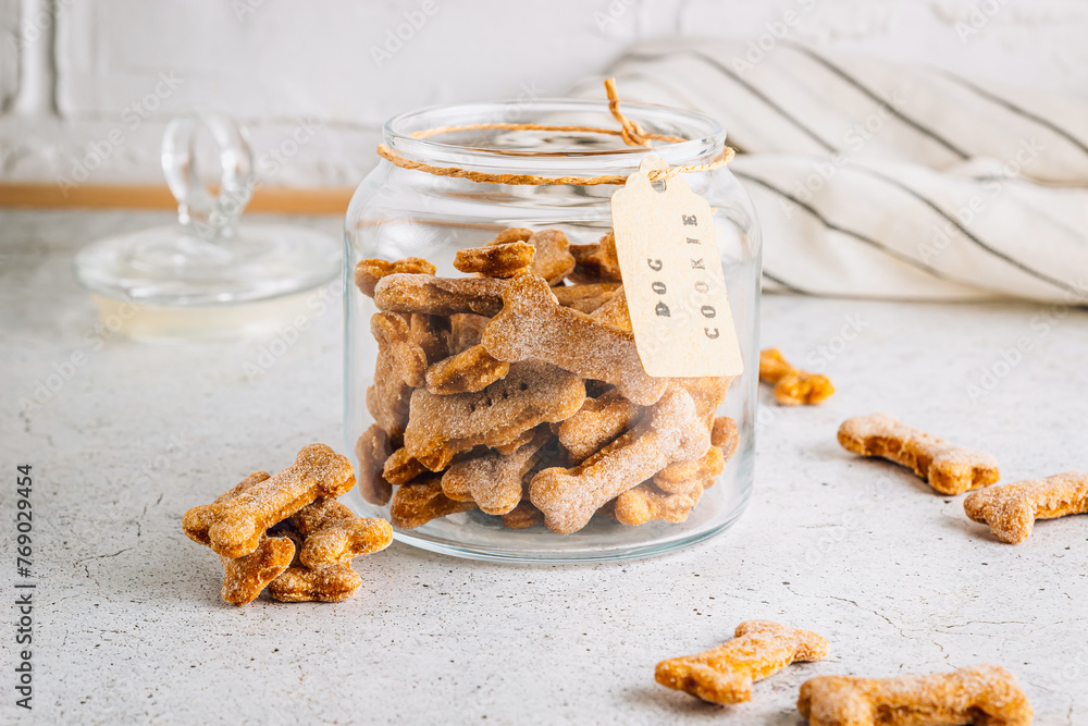 Homemade and healthy pumpkin dog bone cookies. Some on cooling rack with some on a plate. Top view