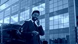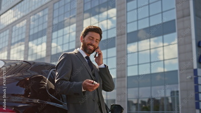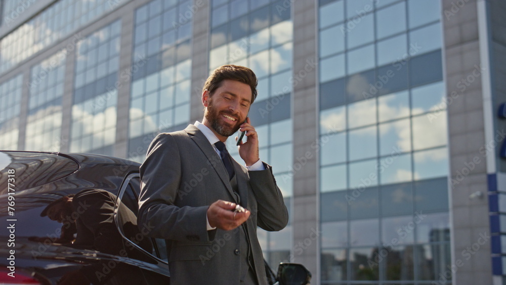 Satisfied businessman talking smartphone playing with car keys closeup zoom in.