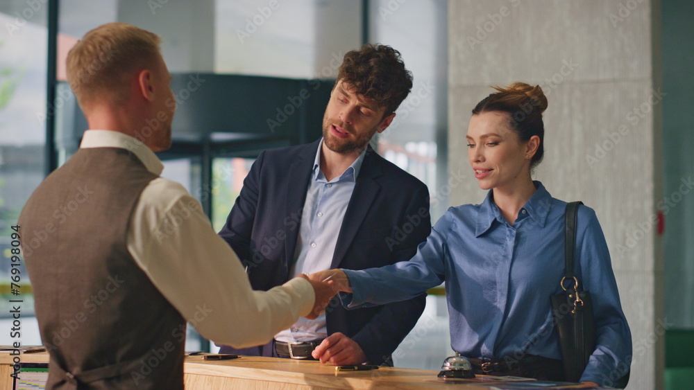 Travelers couple check hotel on holiday trip. Beautiful woman paying contactless