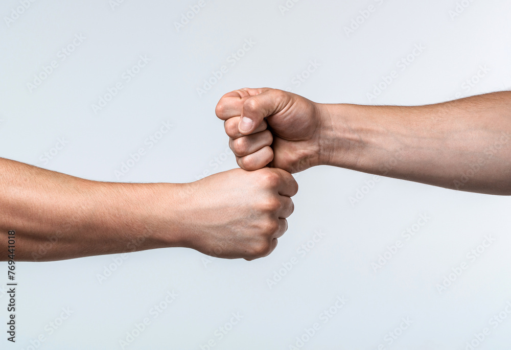 Fist bump. Clash of two fists, vs. Gesture of giving respect or approval. Friends greeting. Teamwork and friendship. Partnership concept. Mans are fist bumping