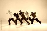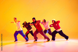 Dynamic portrait of young dancer in streetstyle clothes dancing in neon light against gradient colorful studio background. Concept of hobby, sport, fashion, action, youth culture, music and dance.