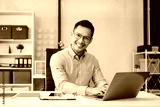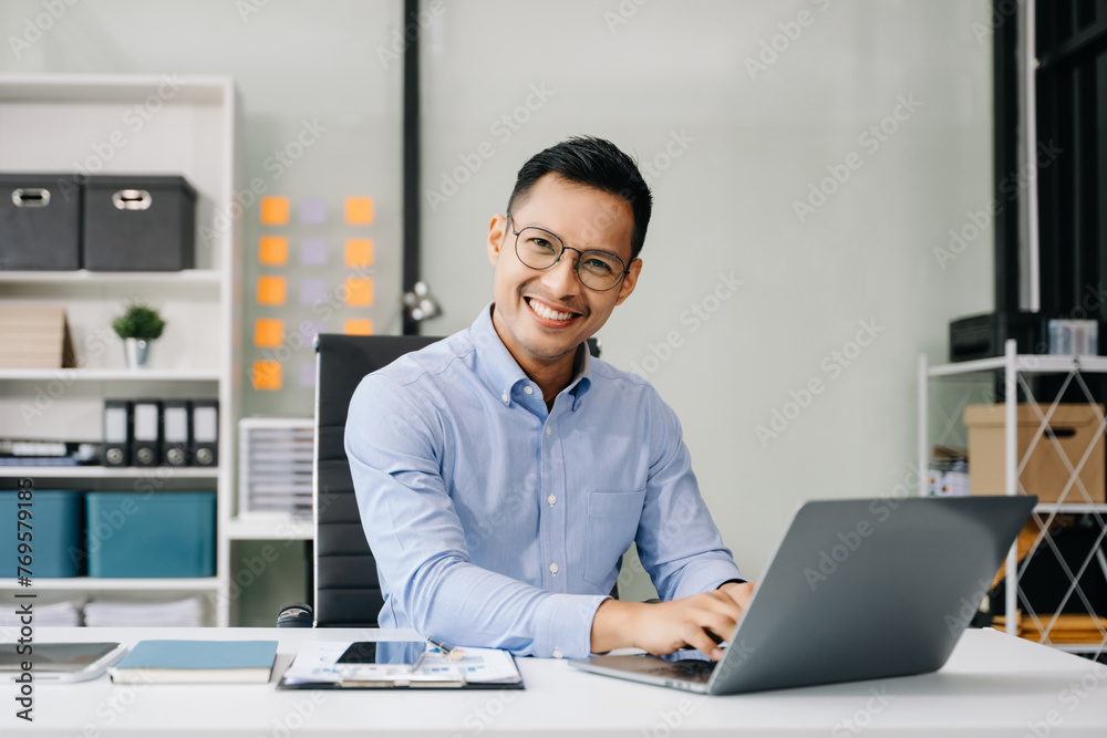 Asian man using laptop and tablet while sitting at her working place. Concentrated at work.