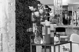 Showcase of cosmetic products. Products are arranged on the table, some towards the front, others towards the back. But there are vases of flowers on the table