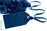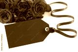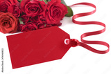 Red roses valentine gift with blank gift tag label and ribbon isolated white photo